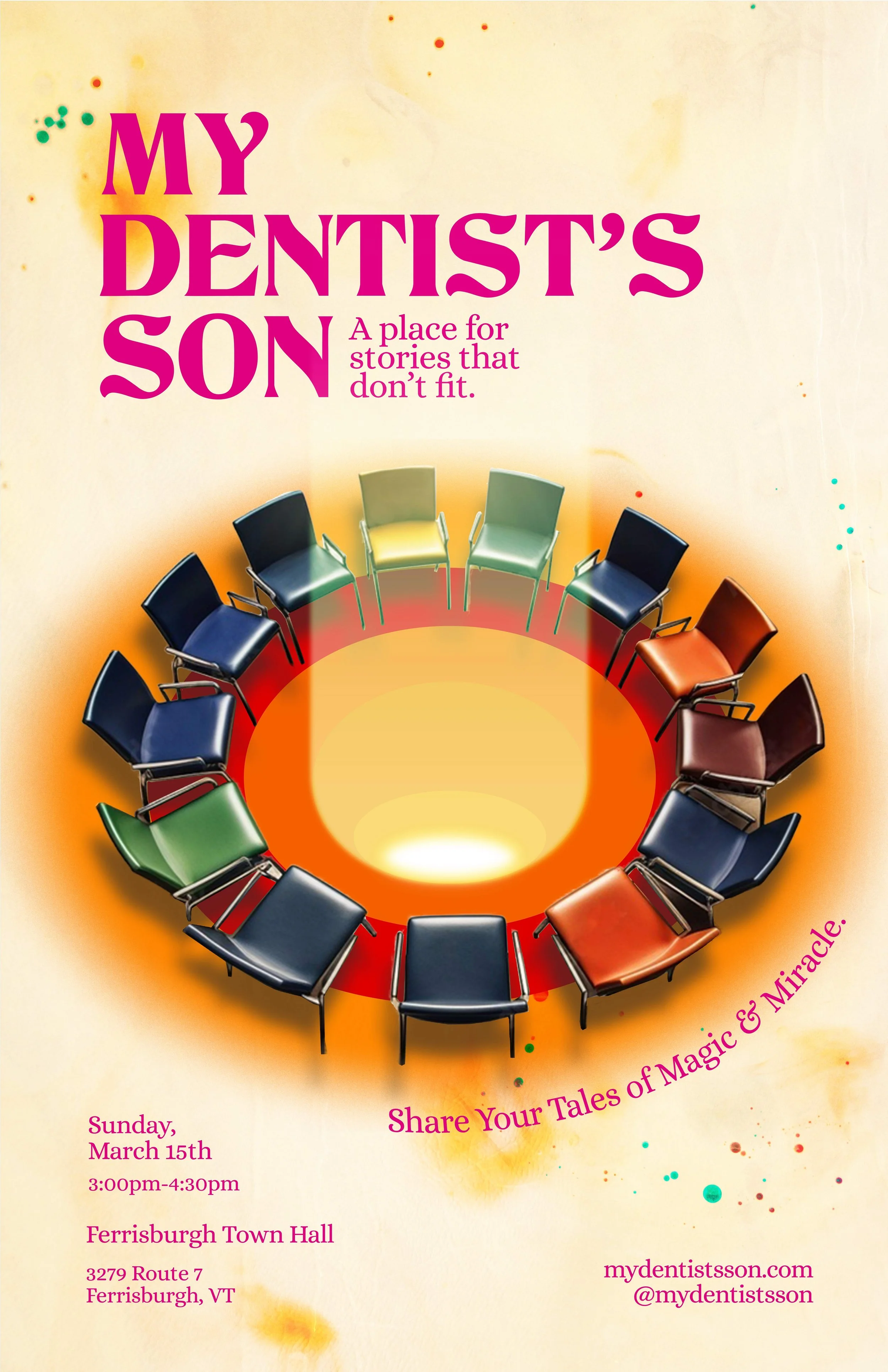 Some of the most beautiful moments in life—the ones we immediately know are special—tend to defy explanation. My Dentist’s Son is a home for these moments, a storytelling circle designed to honor the mystical experiences we’ve been graced with and to invite more of them into our lives. Join us as we remind each other just how magical this world can be.